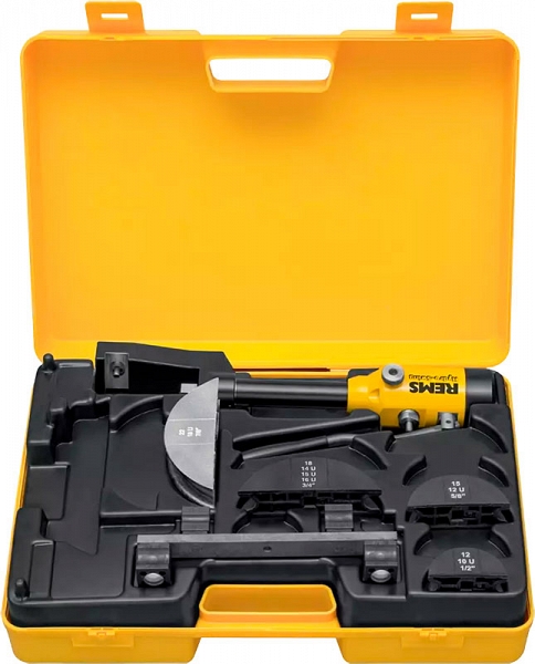 Трубогиб гидравлический ручной Rems Hydro-Swing Set 12-15-18-22 мм (Ремс Гидро-Свинг Сет 12-15-18-22 мм) – удобный масляногидравлический трубогиб для точной гибки мягких медных труб, в том числе тонкостенных Ø 10 – 22 мм, 3/8" – 7/8", толщиной стенки до 1 мм; мягких медных труб в оболочке Ø 10 – 18 мм, 3/8" – 5/8", толщиной стенки до 1 мм; труб систем запрессовки из нержавеющей никелевой стали Ø 12 – 22 мм, толщиной стенки до 1,2 мм; труб систем запрессовки из углеродистой мягкой стали с оболочкой Ø 12 – 18 мм, толщиной стенки до 1,2 мм; прецизионных мягких стальных труб Ø 10 – 22 мм, толщиной стенки до 1,5 мм; металлопластиковых труб Ø 14 – 32 мм; на угол до 90°. Идеален для работ на месте монтажа. Для мастерских и промышленности. Для стройплощадки и мастерской.